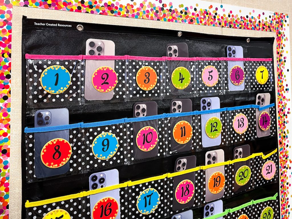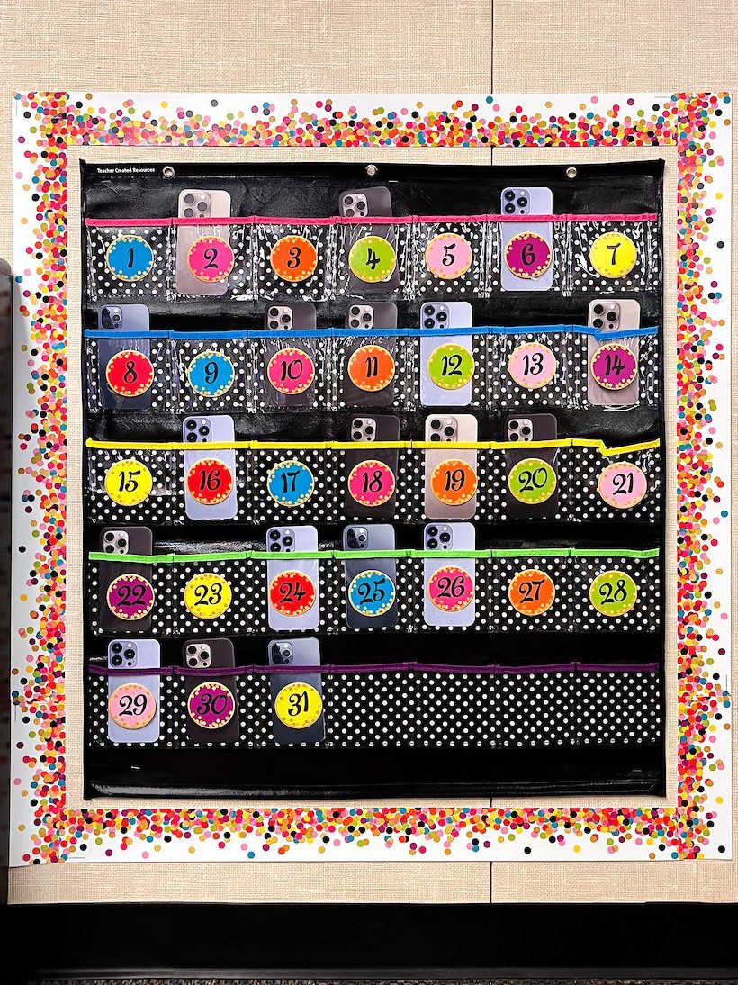 Start with a pocket chart with ample space—such as the 35-pocket Black Storage Pocket Chart or the Black Polka Dots Storage Pocket Chart—for an inexpensive-yet-creative solution for handling cell phones in any class.