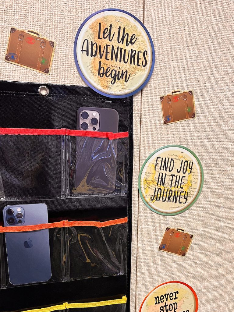 Draw inspiration from high-end resorts with a “cell hotel” for collecting phones. Elevate the display by adding elegant accents and travel-themed decor for a solution that’s as clever as it is useful. Travel the Map Luggage Mini Accents and Travel the Map Positive Sayings Accents create a cohesive theme that students love.