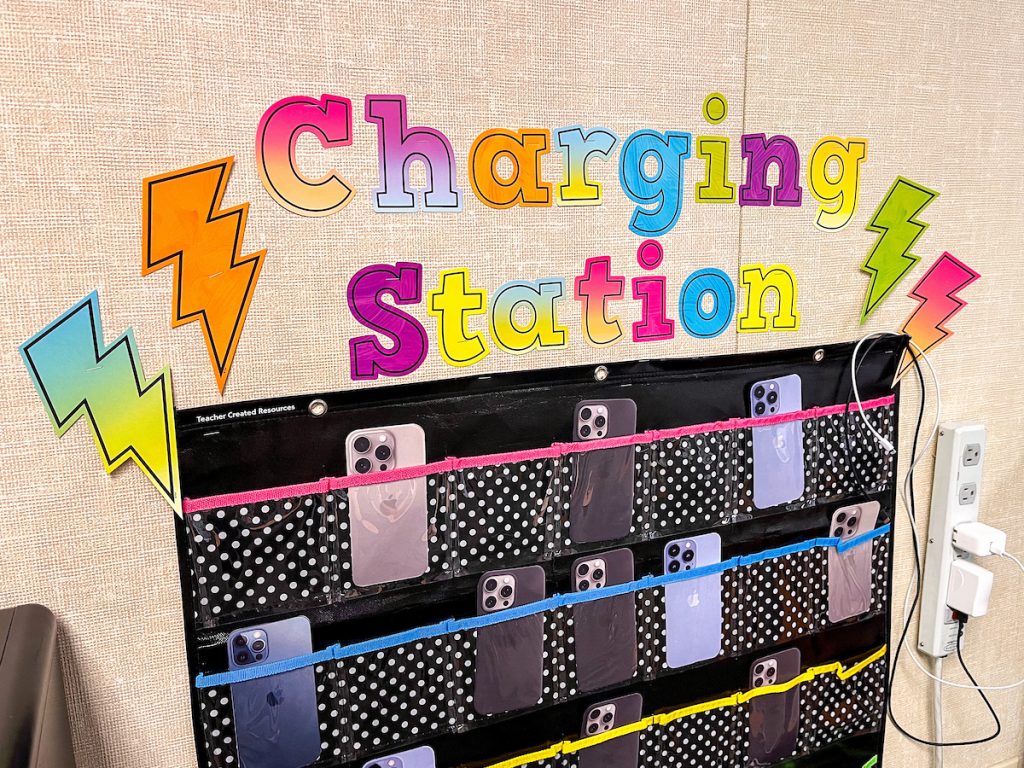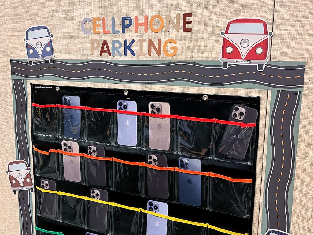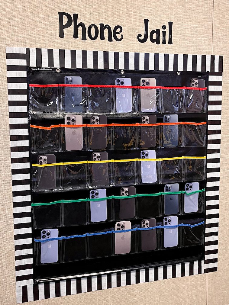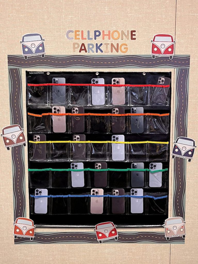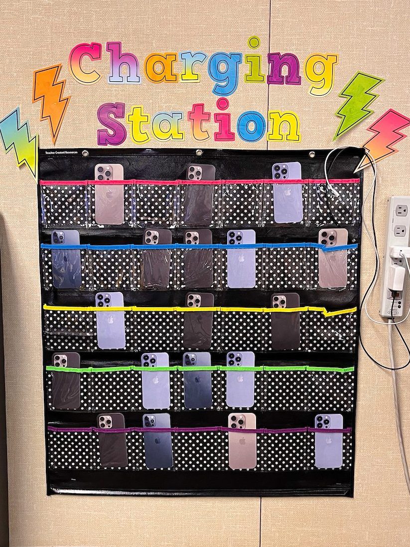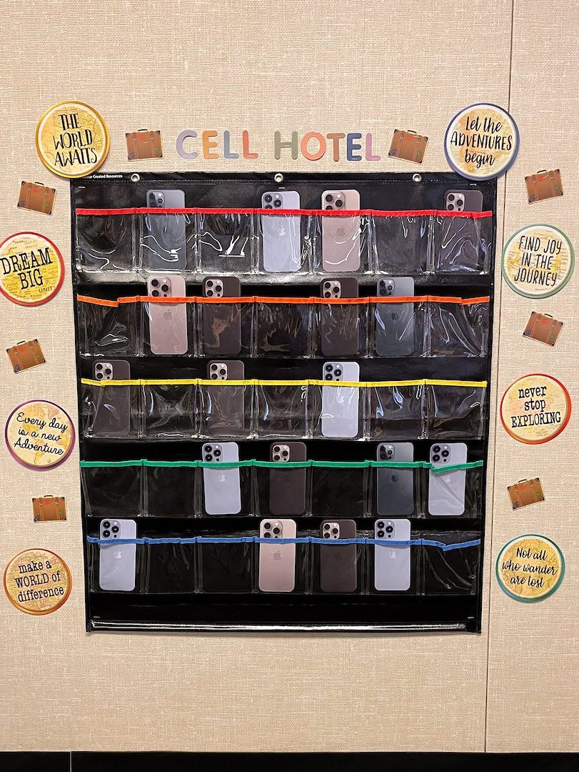 Make the order and organization of cell phone storage trendy with a cohesive theme. From a playful “cell block” prison-style solution to an elevated cell hotel, there are tons of themes you can bring to your in-class phone storage solution.