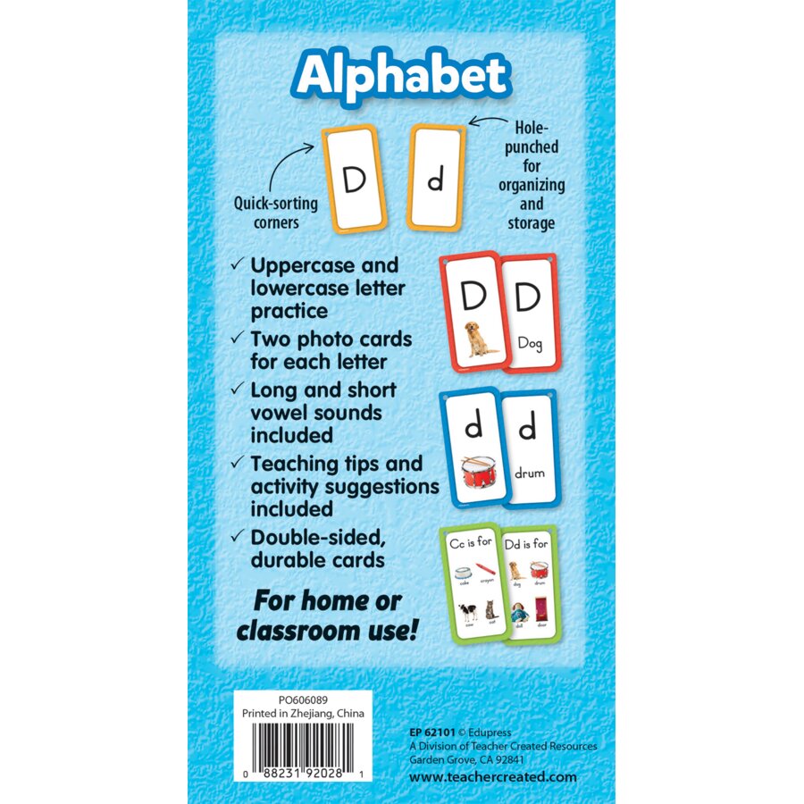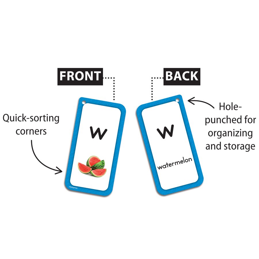 Make learning the alphabet easy as ABC with these flash cards. Featuring uppercase and lowercase letters with photos and words, these flash cards strengthen letter identification and letter-sound correspondence skills. Use in small groups, as a class, or for independent practice. Pre-punched holes make organization and storage a snap, so it’s simple to keep the whole deck together. Pack includes 96 double-sided flash cards. Each card measures about 3" x 5-3/4".