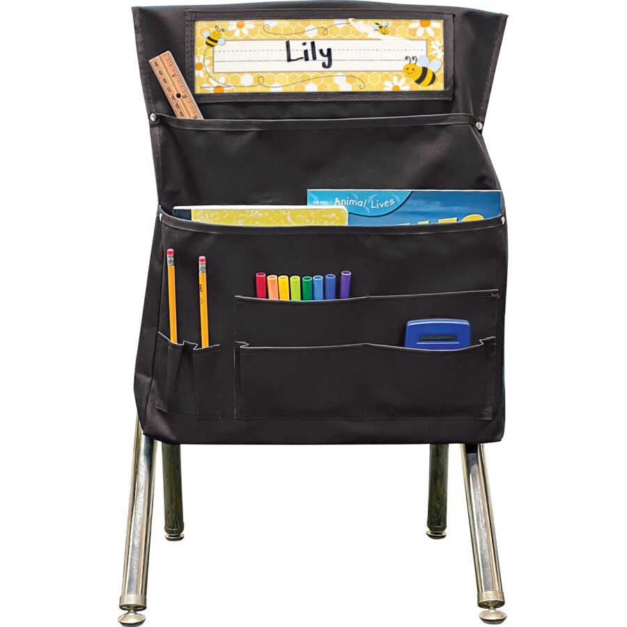 Organize supplies with this convenient storage solution. Clear pocket holds name plate up to 3½" x 11½". 7 storage areas: Large pockets are ideal for workbooks, folders, etc. and small pockets are ideal for supplies. Made with durable canvas. Metal rivets provide extra strength at stress points. Easily slides over back of chairs up to 13" wide, 5" from top. Measures 15½" x 19".