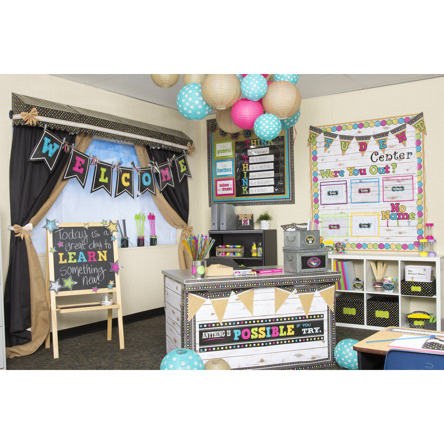 Give your classroom a glamorous makeover with this fancy Chalkboard Brights awning. Mix and match your favorite patterns and colors to create the perfect themed classroom. Hang this sturdy awning over your bulletin boards and entryways, organize work areas, or make fun learning corners. Approx. 24” W x 12-1/2” H x 8 D.