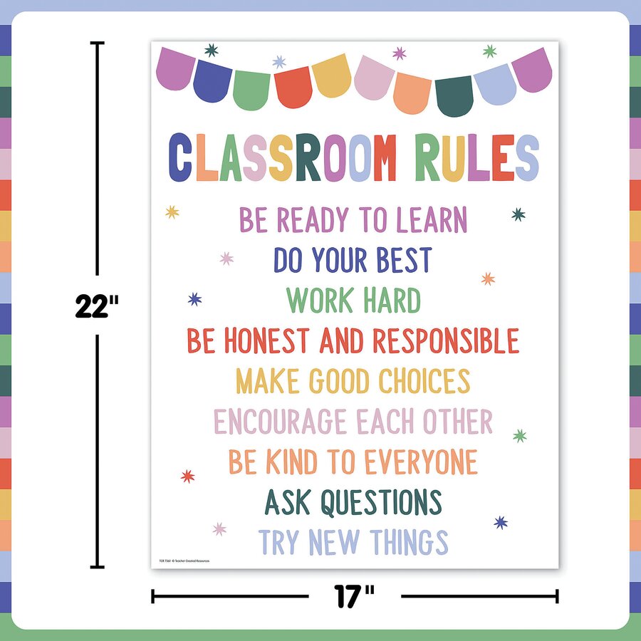 Create a sense of calm and structure in your classroom with this colorful rules chart. Featuring cheerful, bold colors and celebratory designs, this chart is perfect for bulletin boards, student work areas, or classroom walls. Large words make this chart easy to read from a distance while fitting neatly into your classroom setup. Hang up and review with students at the beginning of the school year to set behavioral expectations from day one. Each poster measures 17" x 22".