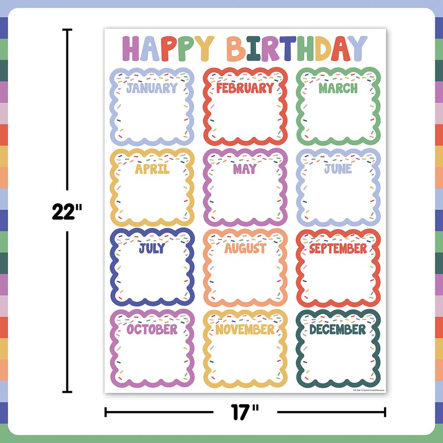 A star is born every day! Capture all of your class birthdays on this wall chart. Featuring cheerful, bold colors and sprinkle designs, this birthday chart is perfect for bulletin boards, student work areas, or classroom walls. Fill in each month with student names, and use this information to plan parties and other classroom festivities. Students will feel seen and celebrated, making every class birthday memorable. Each chart measures 17" x 22".