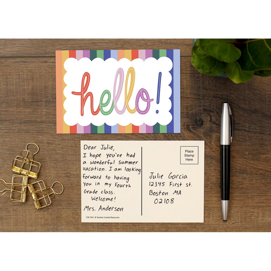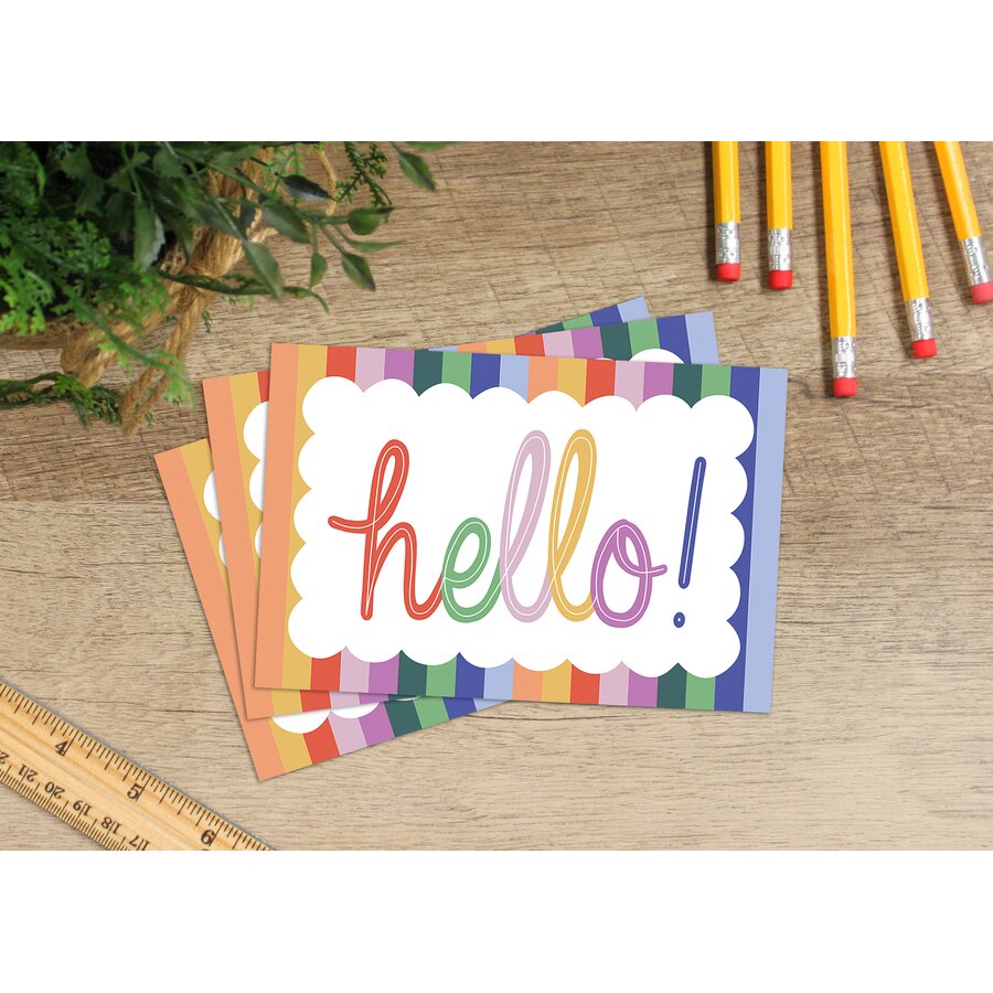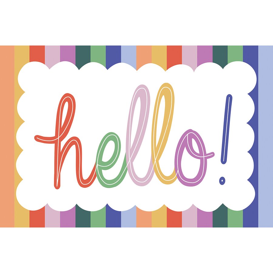 Welcome new students, foster class communication, or simply send any message with these cheerful postcards. Drop them in the mail before summer ends, or hand deliver on the first day of school to introduce yourself. Bright colors, trendy stripes, and a scallop-edged "hello" bring a modern, playful vibe to your classroom that every child will love. The pack includes 30 pieces with multicolor stripes and “hello” written in a modern, handwriting font. Each postcard measures 4" x 6".