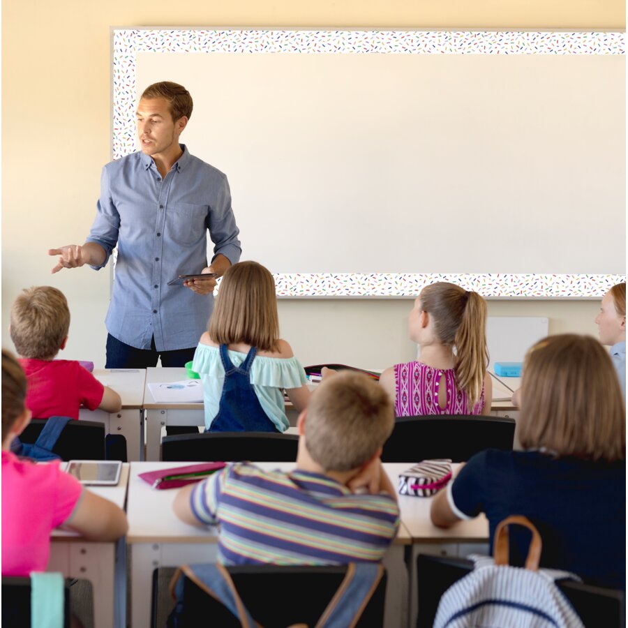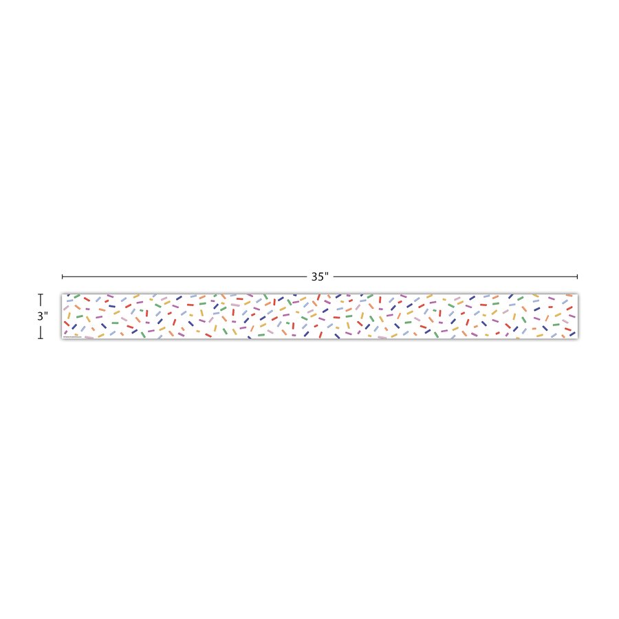Bring a sprinkle of fun to your classroom with this border trim. Featuring a colorful sprinkle design on a white background, this straight trim creates a celebratory vibe in any space. Decorate windows, walls, and bulletin boards. Adorn cubbies, desks, and bins, or pair with additional party-themed decorations for a cohesive look that’s perfect for any classroom, school event, or party. Each pack has 12 pieces (35" x 3") for a total length of 35 feet of trim.