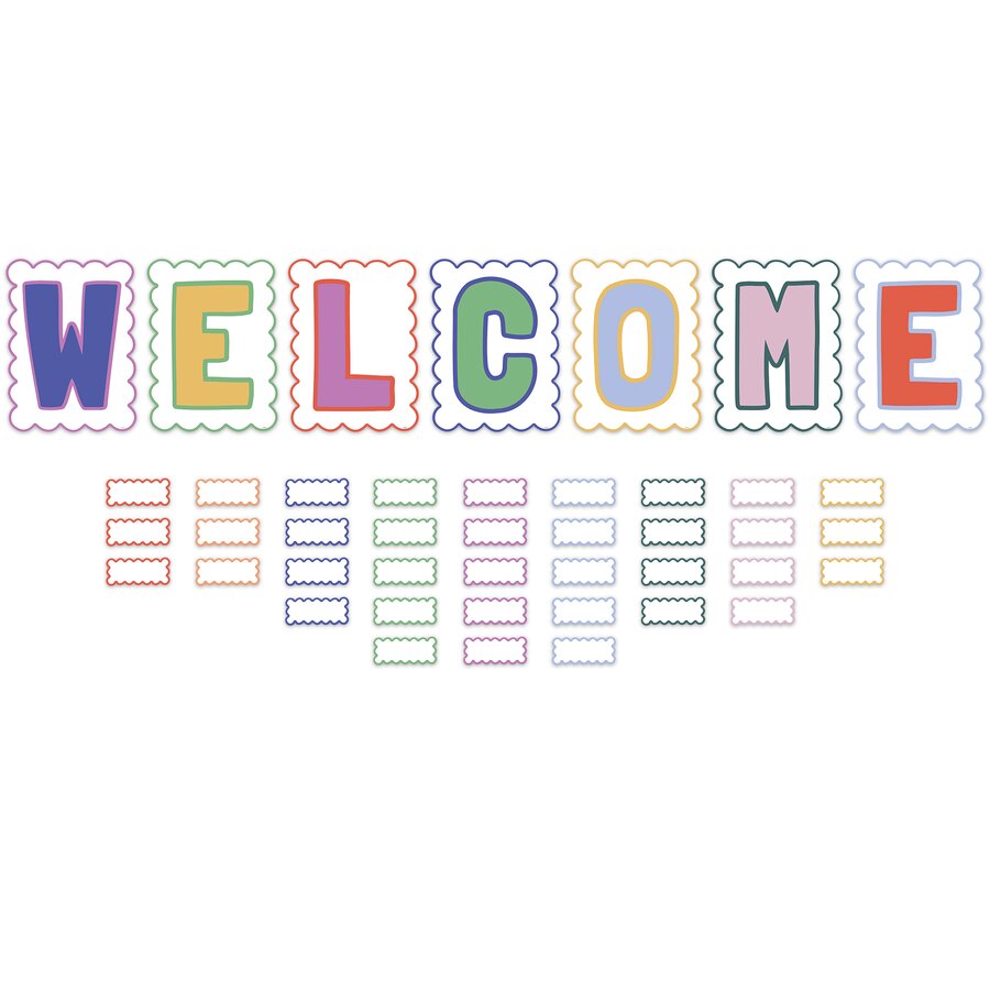 Greet students at the beginning of the school year with this wall display. Featuring trendy colors, scalloped edges, and an easy-to-read message, this sign is ideal for saying hello to attendees who visit the office, library, sports game, or any other school event. Multi-purpose blank accents can be used as name plates, or to label bins, desks, and learning centers. 43 total pieces. Each letter measures about 11-3/8" x 15". Tags are 5-1/2" x 2-1/2".