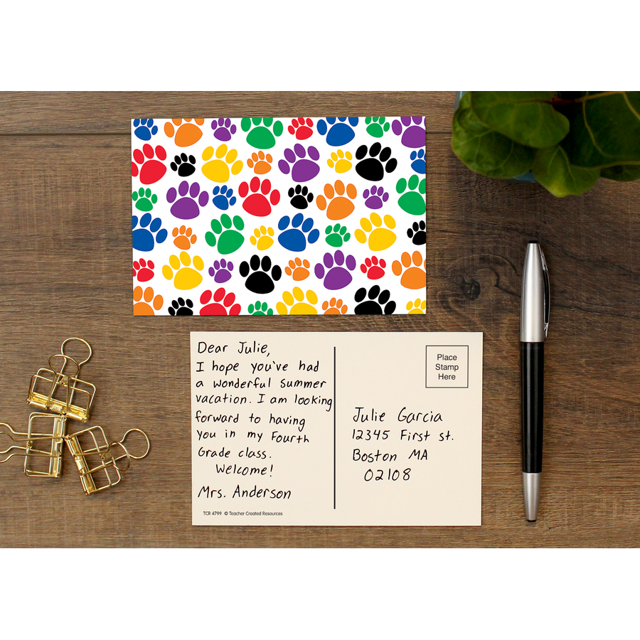 Reaching out to your students becomes simple and inexpensive with these paw print postcards. Drop the personalized notes in the mail or hand-deliver the postcards to your students in the classroom. Postcards are printed on heavy paper. 4" x 6". 30 per pack.