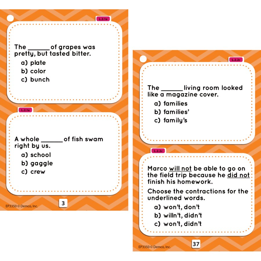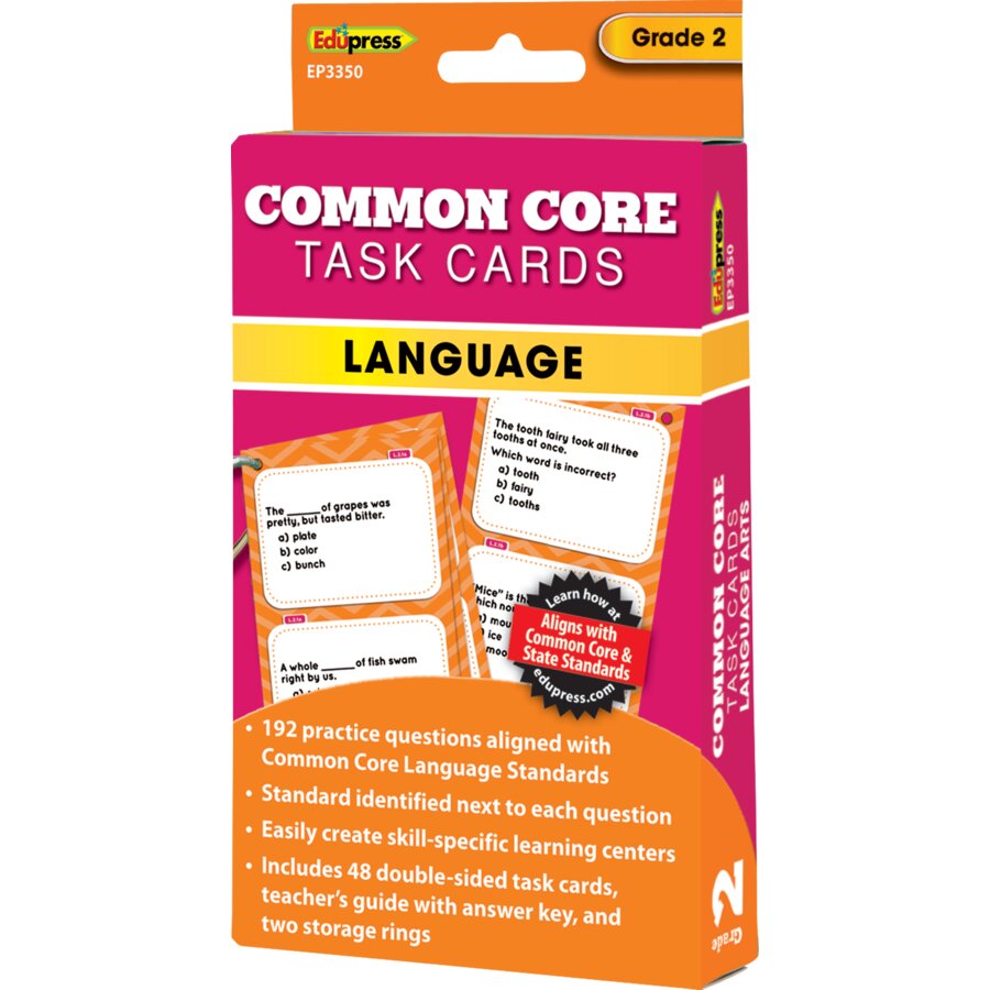 Create an instant language learning center with 192 questions aligned to Common Core Language Standards! Questions cover all the Language Standards at each grade level. Each question lists the exact standard it addresses, so teachers can assess areas of student difficulty. Questions include practice with Conventions of Standard English, Knowledge of Language, and Vocabulary Acquisition and Use. 48 double-sided cards, two rings, and a reproducible answer key. Cards measure 3-1/2" x 5-1/2".