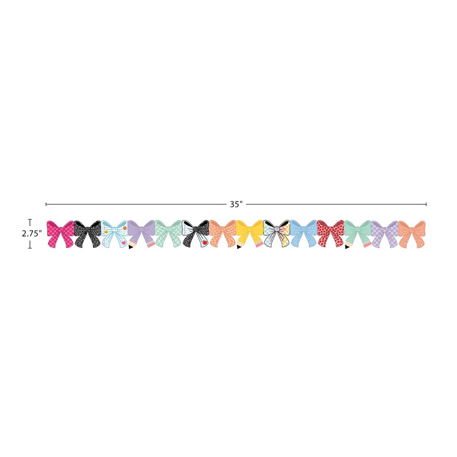 Brighten up your learning space with this modern bow border trim. Featuring a variety of school-themed prints and a bow design, this die-cut trim livens up bulletin boards, walls, and doors. Decorate cubbies, desks, and bins. Energize your art corner. Combine with more decor and accents with new school vibes for a trendy, one-of-a-kind classroom where students feel welcome, engaged, and ready to learn. Each pack has 12 pieces (35" x 2-3/4") for a total length of 35 feet of trim.