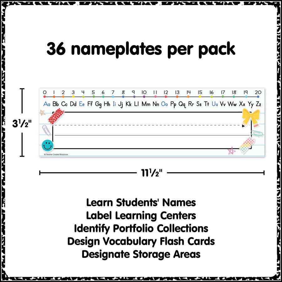 Bring a stylish touch to classroom organization with these modern name plates. Featuring school-themed motifs and prints, these plates are perfect for personalizing desks and getting to know your class. The alphabet (with vowels highlighted) and a 0–20 number line make useful references students can use again and again. Laminate for a lined writing space that students can use to properly align their letters, practice penmanship, and make their handwriting legible. The pack includes 36 plates printed on thick, coated paper stock. Each name plate measures 11-1/2" x 3-1/2".