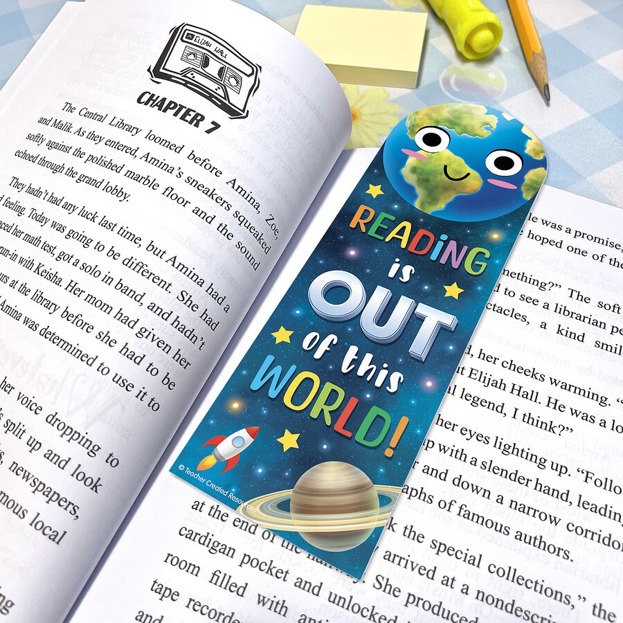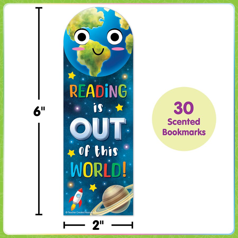 Take a reading journey to the cosmos with these scented bookmarks! Featuring space-themed art, a positive message, and a grape scent, these bookmarks are great for positive reinforcement. Use as treasure box prizes and student incentives, or give out alongside books at the library or book fair. Each pack includes 30 pieces. Each piece measures 2" x 6".