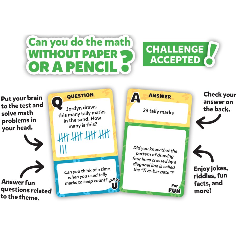 Practice basic math skills without the use of pencil and paper! This set of 200 cards challenges young learners to solve single- and multi-step calculations in their head. The front of each card includes a word problem and a fun personal question related to the theme, while the back shows the correct answer and provides an extra fact or joke—“just for fun.” Use these cards in the classroom to fill time before recess or as a transitional activity, or use them at home or on the go. Fun for individual practice or as a group challenge!