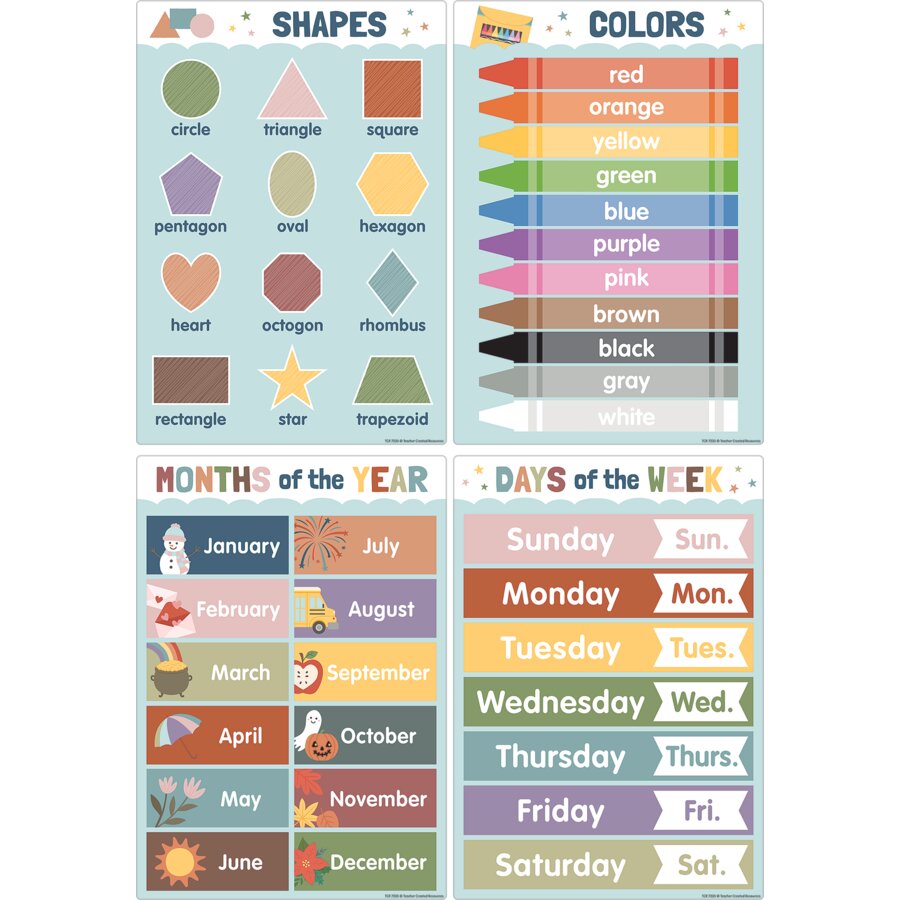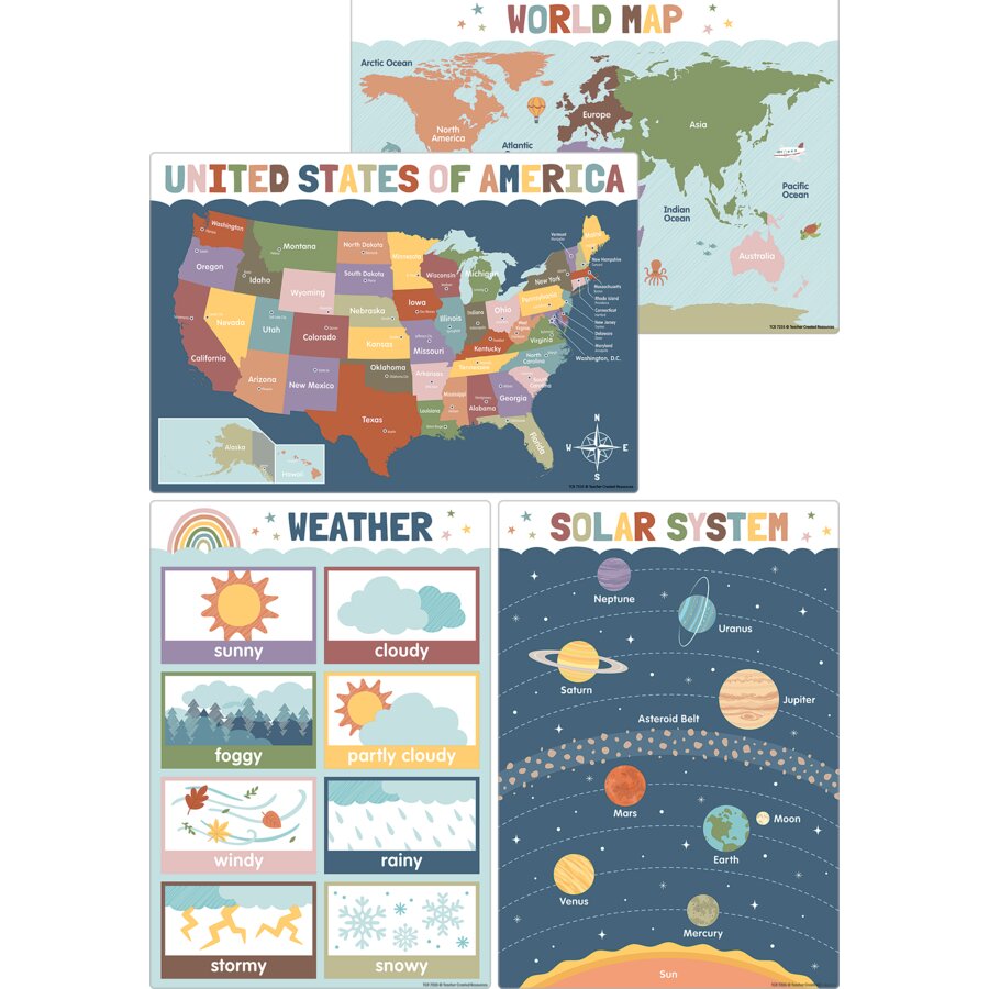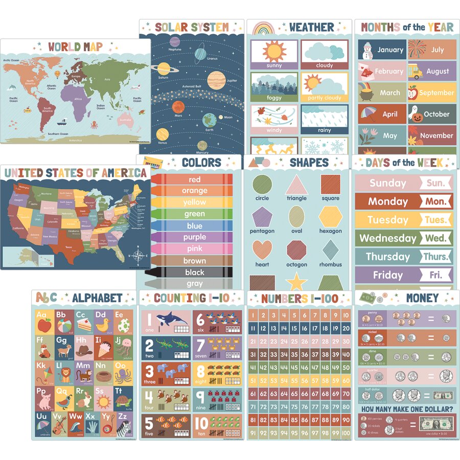 Little charts, huge impact! Help students master foundational skills with this informational decor. Display them all together as a cohesive educational guide that your students can reference again and again. Featuring muted earth tones, these posters invoke a calming vibe that’s ideal for little learners. The pack includes 12 small posters, each covering a different early learning concept: Numbers 1–100, Colors, Shapes, Weather, Days of the Week, Months of the Year, Counting 1–10, Alphabet, Solar System, United States of America, World Map and Money. Each poster measures 11" x 15-3/4".