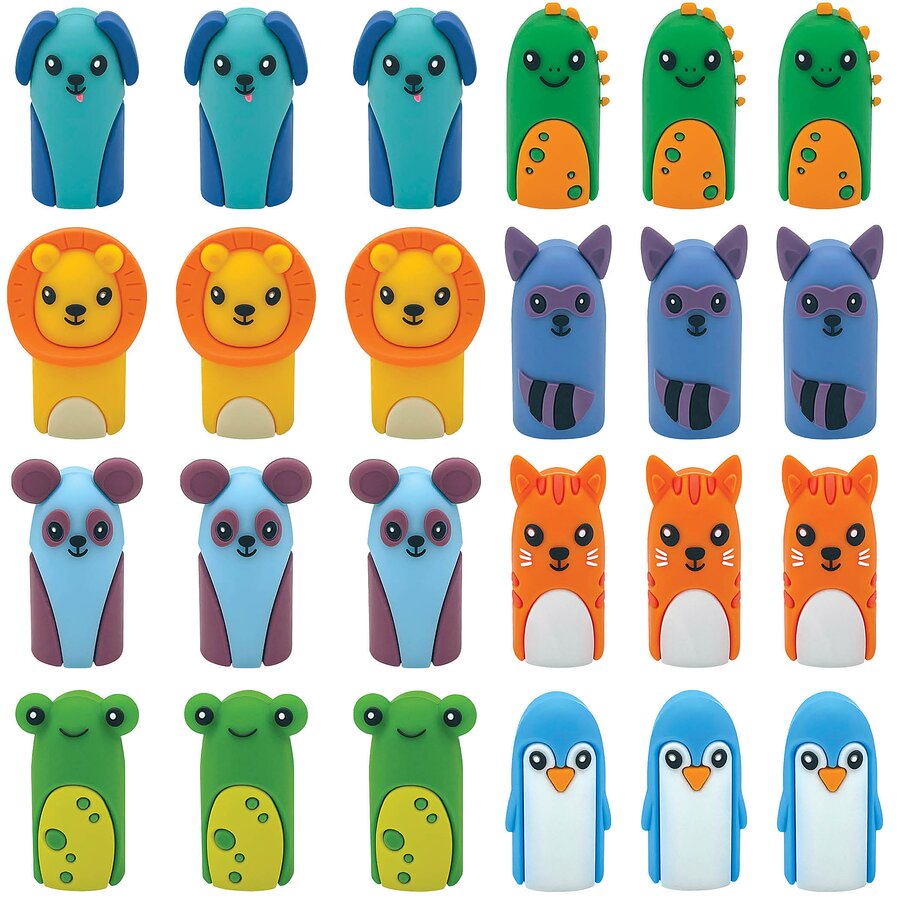 Keep students motivated with these cute and functional animal erasers. Featuring brightly-colored animal designs that fit snugly on your fingertip, these erasers offer a fun solution for ensuring students can keep their schoolwork clean and legible. Use them in treasure chests, for student incentives, or as gifts for holidays. By continuously monitoring and celebrating student achievements, you create a classroom where students feel energized and ready to learn. Each pack features 24 erasers: 3 each of 8 different animal designs. Each eraser measures about 2" L x 1" W x 1" H.