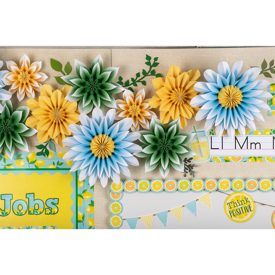 Create a colorful and unique look with these gorgeous paper flowers. Add depth and dimension to walls, backdrops, table decorations, and much more! No assembly required-opens easily and stays together with a hidden magnet. Folds back up for easy storage, so they can be used again and again. Four flowers per pack. Each pack includes one 16" light blue flower with yellow center, one 11" solid yellow flower, one 11" green flower, and one 8" yellow flower.