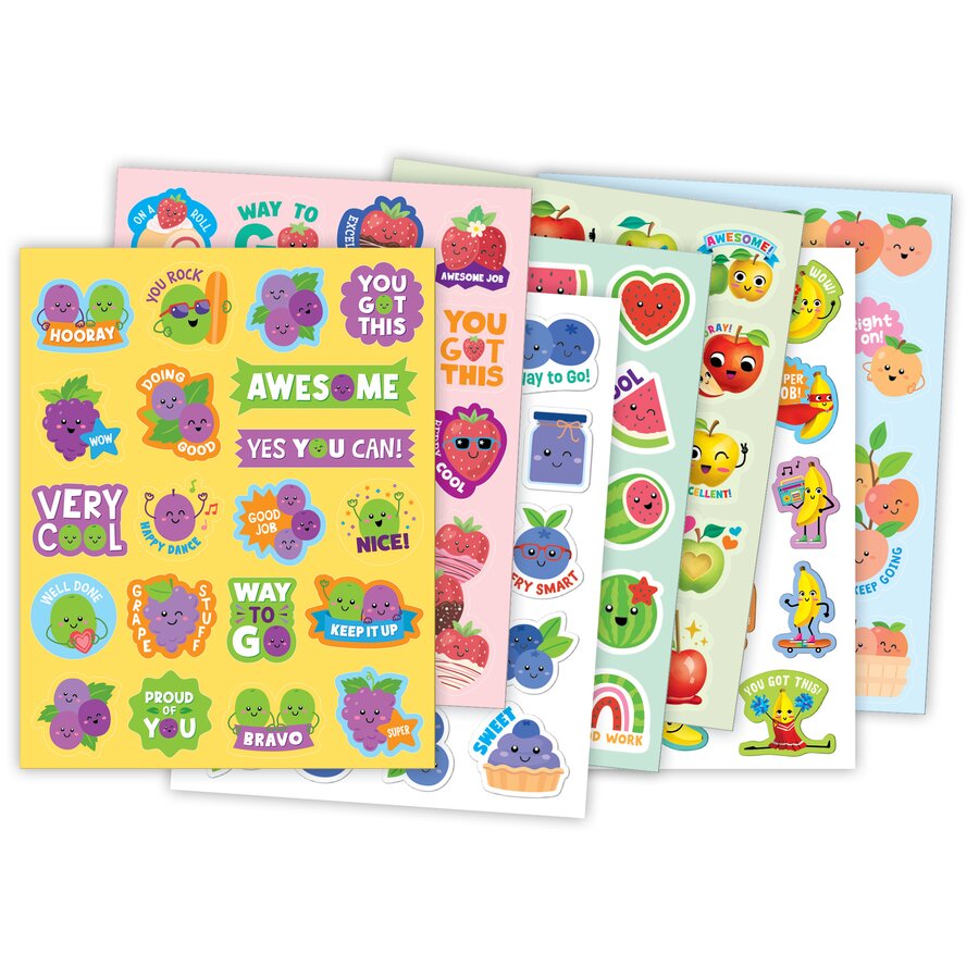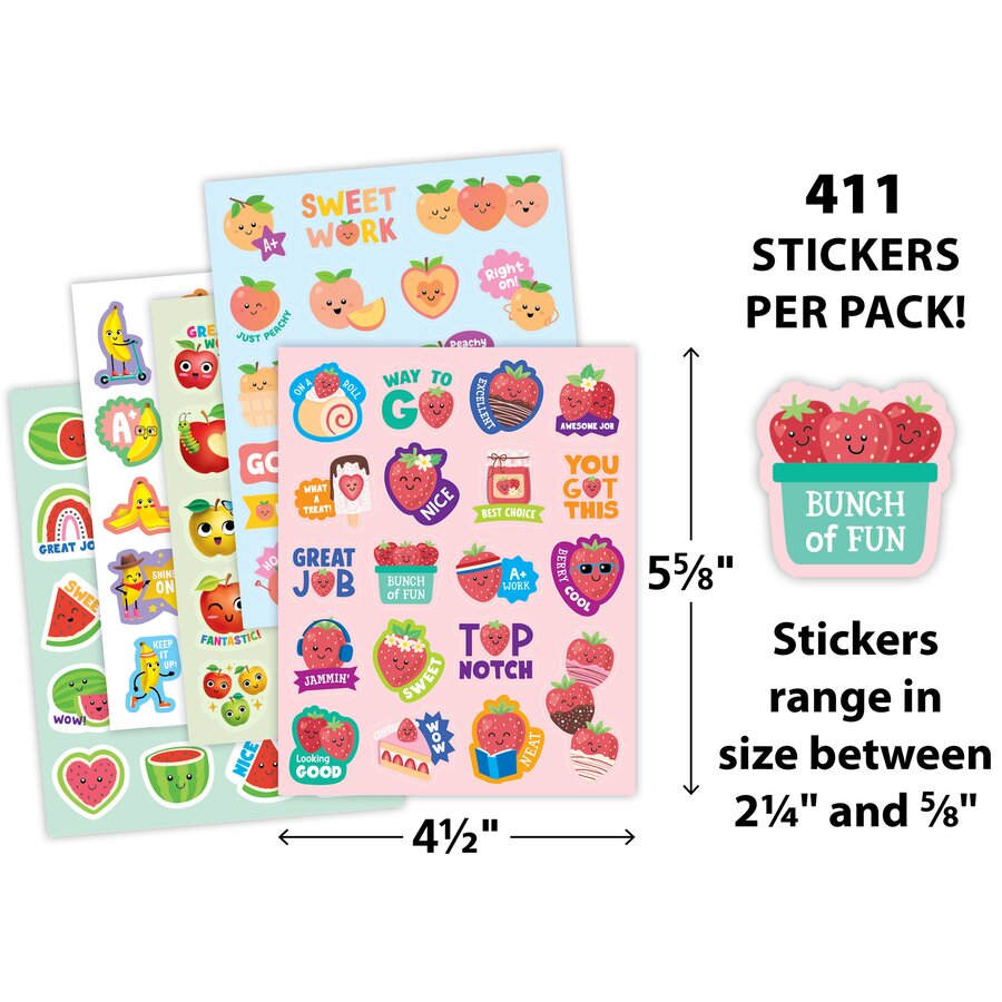 Scratch them, sniff them, collect them! Motivate students to stay on task with these fruit-scented stickers. Each sticker comes with a fun fragrance that makes classroom rewards even sweeter. Ideal for grading papers, decorating assignments, or adding a special touch to classroom activities, these smelly stickers are a great tool for positive reinforcement. Pack includes 411 non-toxic, acid-free and lignin-free stickers in 7 scents: grape, strawberry, blueberry, watermelon, apple, banana, peach. Sticker measurements vary from about 2-1/4" to 5/8".