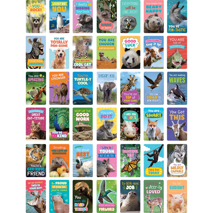 Show students your wild side! Boost confidence, acknowledge accomplishments, or simply lift student spirits with this card deck. These encouragement cards each feature a different animal, bright colors, and a positive message to inspire students. From fierce predators to lovable llamas, each piece captures the essence of the wild, adding an adventurous flair to any space. Every one-of-a-kind card measures 2-1/8" x 3-1/2".