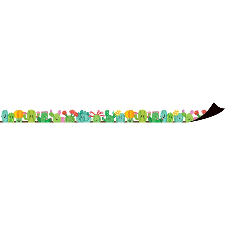 Create a classroom that brings students straight to the southwest with this magnetic border trim. Featuring cheerful succulents, this trim is perfect for adding a fun, quirky vibe to any metal surface. Instantly decorate whiteboards, metal doors, and other magnetic surfaces to add personality to your space in a snap. Add more cactus-inspired decor for a coordinated classroom where students can grow, thrive, and stay sharp! Each pack contains 12 magnetic strips (about 24" x 1-1/2" each) for a total of 24 feet.