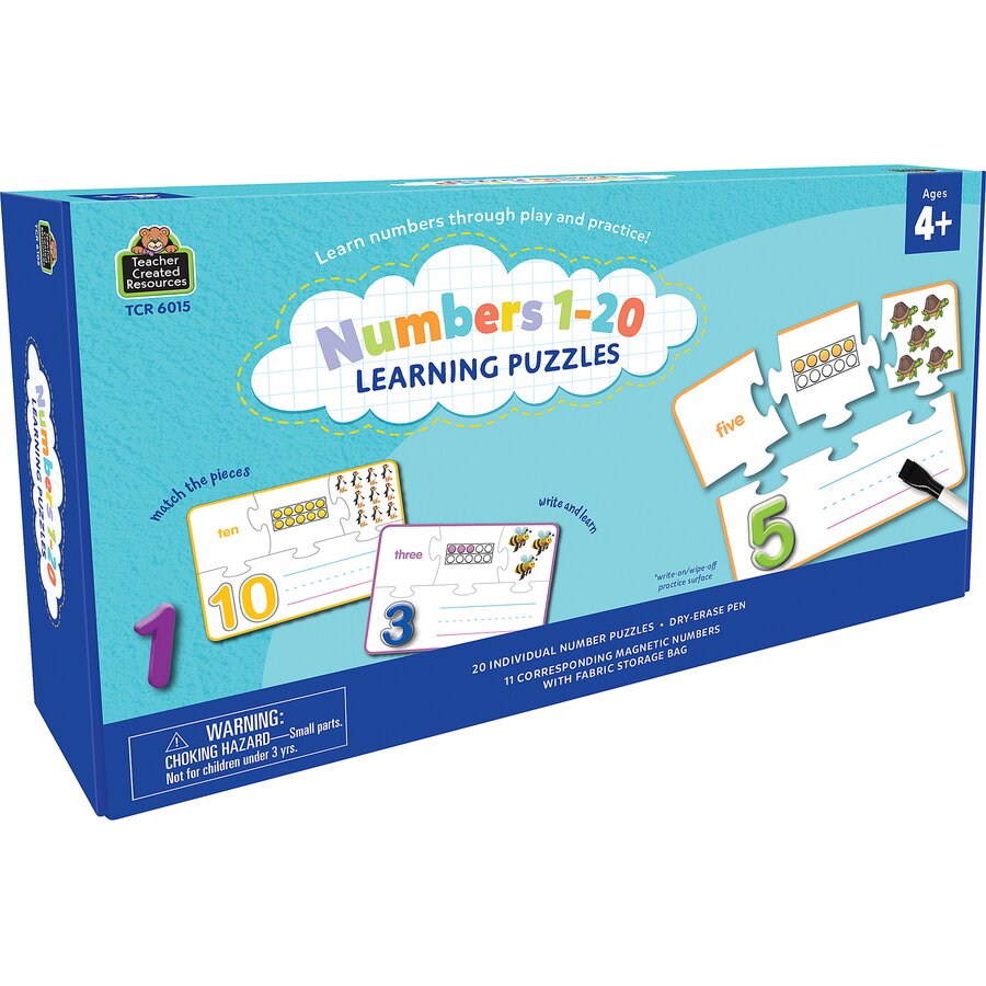 Help children learn numbers with these engaging learning puzzles. Set includes 20 four-piece puzzles featuring bright, colorful images and a color border to guide assembly. Kids trace the numbers, count objects, and match magnetic numbers. Children can expand their learning by using the magnetic pieces on any magnetically receptive surface. Both sets include a write-on/wipe-off area for repeated practice, magnetic numbers, a dry-erase pen, and a fabric storage bag. Ages 4+.