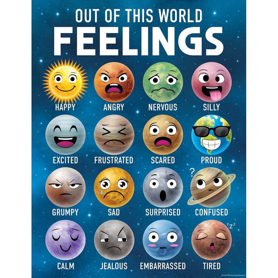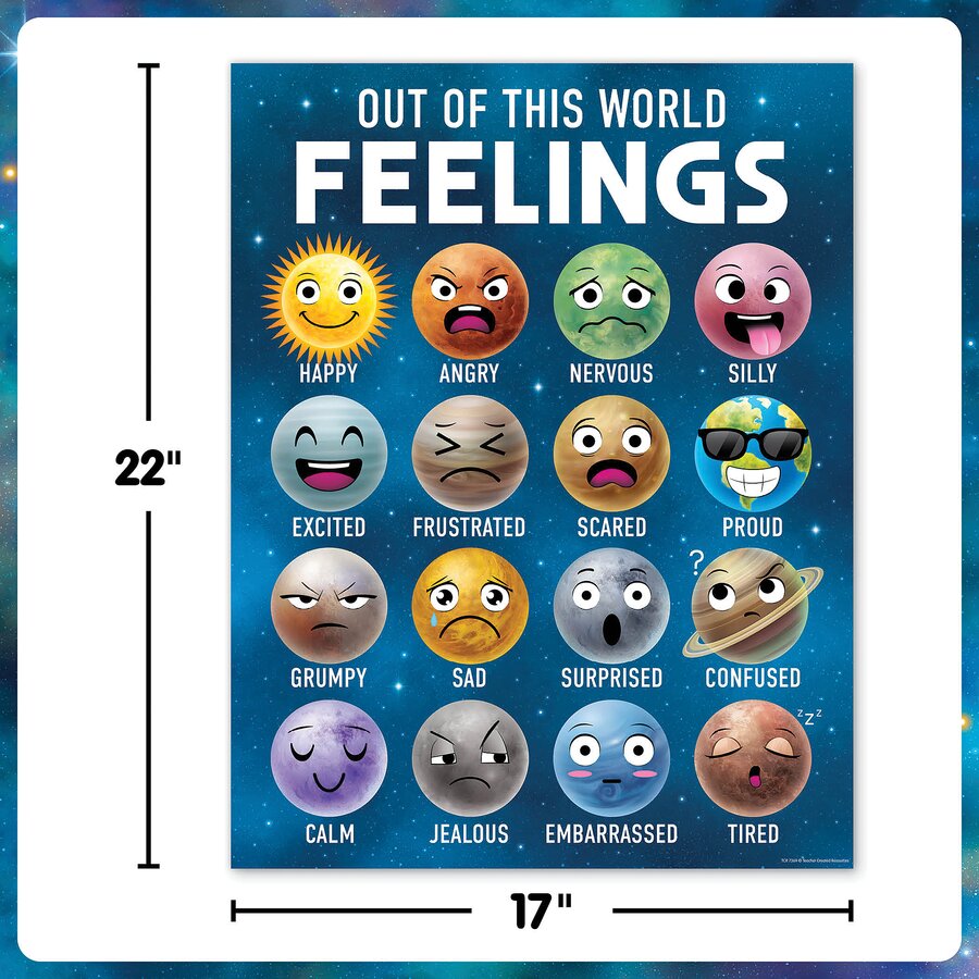Help students identify their emotions with an out-of-this-world feelings chart! Ideal for displaying on a bulletin board or wall, this poster lists out 16 feelings, each with a corresponding planet face, that encourages students to identify and express their emotions. Ranging from happy and nervous to jealous, this sign features a variety of feelings that guide children while building critical social-emotional skills. Perfect for calm-down corners, emotional check-ins, and morning routines. The chart measures 17" x 22".