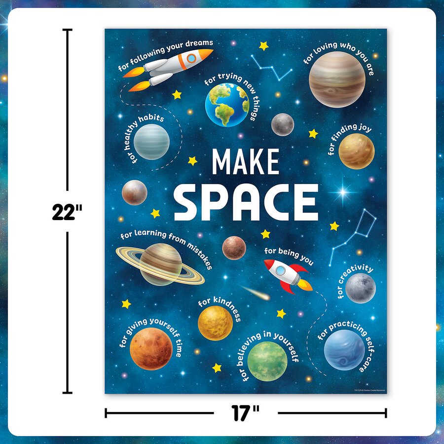 Make space—because all feelings are welcome here! Fuel self-compassion in every student with this poster. Stars, planets, and rocketships adorn a soft blue background with twinkling lights, creating a cosmic calm that’s ideal for every learning space. Push back against perfectionism so students feel comfortable making mistakes. Create a calm-down corner, build self-confidence, and inspire a kind classroom culture—all in a fun solar-system theme. Chart measures 17" x 22” and includes stars, planets, rockets, and 12 actions students can "make space" for in the classroom.