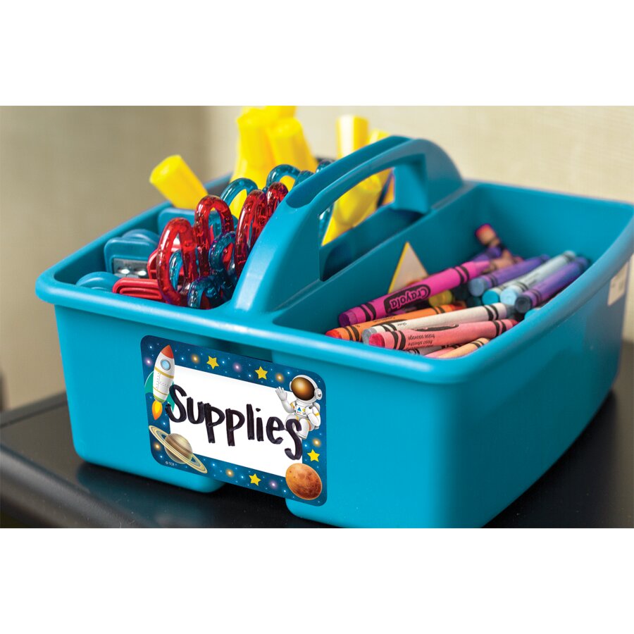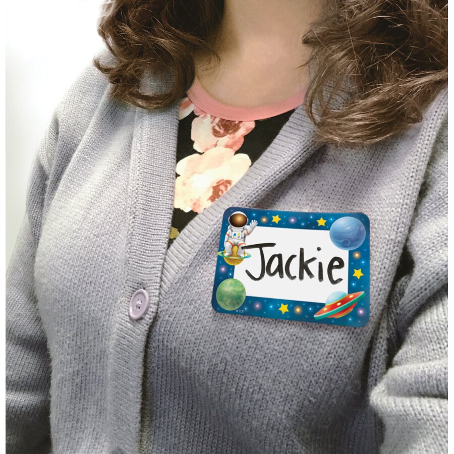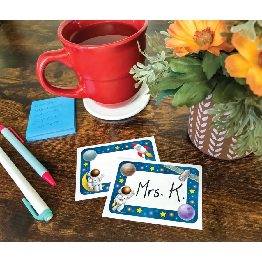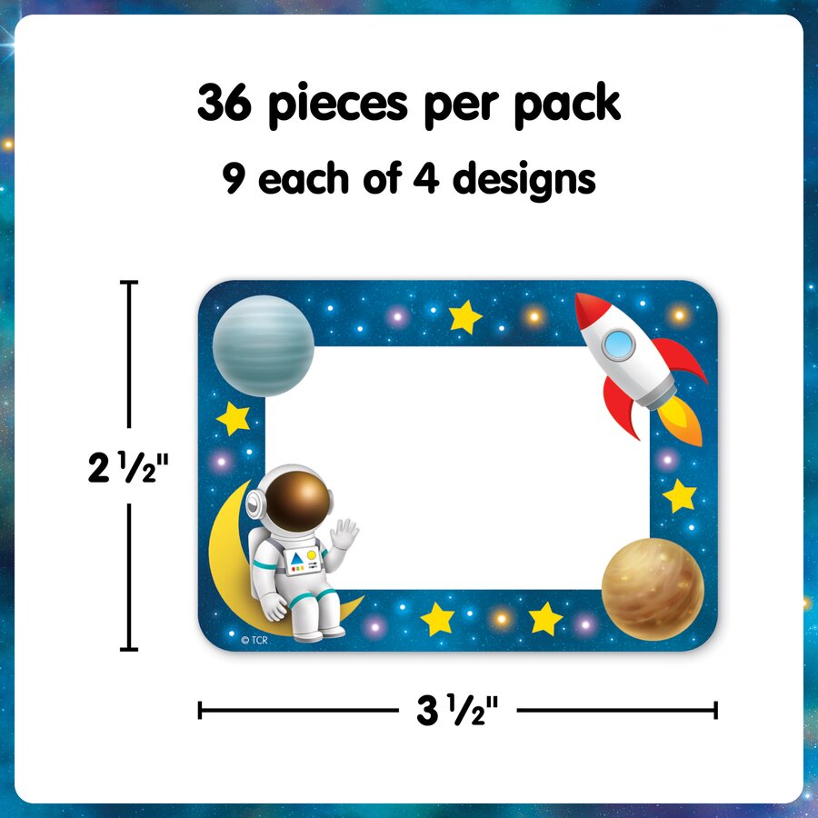Create a cosmic learning space with these name tags! Each label is adorned with stars, astronauts, planets, rockets, and satellites—perfect for adding a solar-system vibe to any classroom setup. Use them to welcome students on the first day, personalize desks, and organize learning centers. Label student portfolios, create nameplates for icebreakers, or use as award badges. These blank, write-on stickers are perfect for folders, cubbies, bins, and other storage. The pack includes 36 colorful name tags featuring out-of-this-world designs. Each label measures 3-1/2" x 2-1/2".