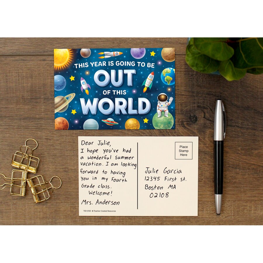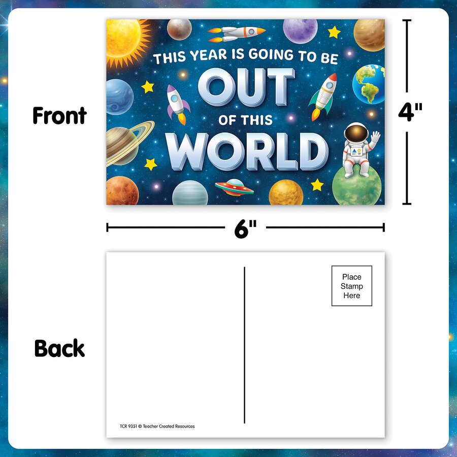 Welcome new students with personalized messages on these galactic postcards. Drop them in the mail before summer ends, or hand deliver them on the first day of school to say hello. Use this solar system-themed stationary to introduce yourself during Back to School, or encourage students to write each other notes. Featuring astronauts, rockets, spaceships, planets, and stars, these cards bring an out-of-this-world vibe to your classroom that kids love. Each pack includes 30 pieces, each measuring 4" x 6".