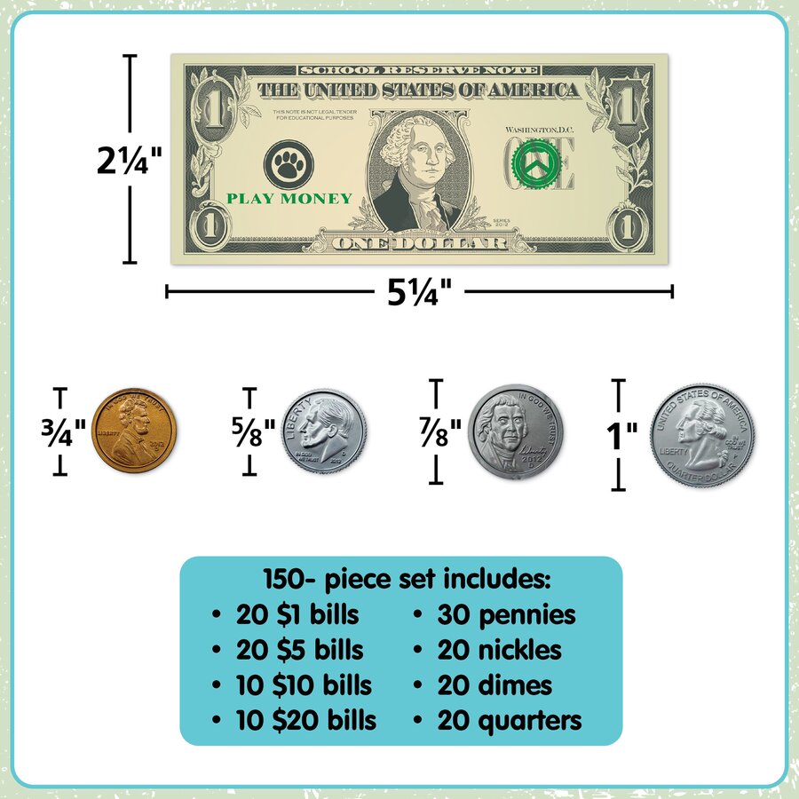 Learn foundational money skills at school or home with play money. Featuring realistic, double-sided bills and coins, this set is perfect for imaginative play, solving math equations, and more. 150-piece set includes: 20 $1 bills, 20 $5 bills, 20 $10 bills, 20 $20 bills, 30 pennies, 20 nickels, 20 dimes, 20 quarters