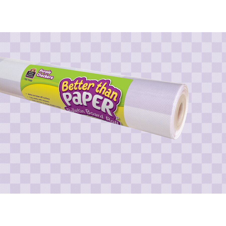Bring a playful vibe to your classroom decor with this Purple Checkers Better Than Paper® roll. This vibrant checkered material won’t fade, wrinkle, or tear. Cut to your desired size and shape, then hang. Attach border trim, accents, posters, and student work using staples or tape, without worrying about noticeable holes. Each roll measures 4' x 12'.