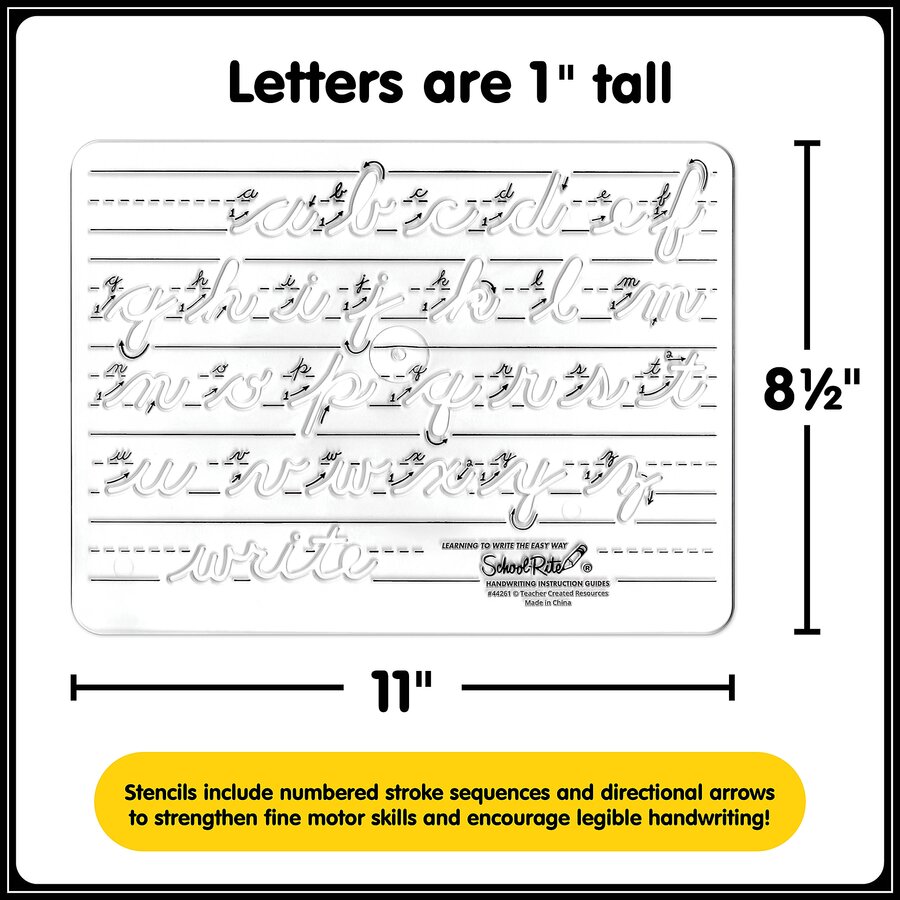 Advance your students' cursive writing skills with this comprehensive instructional guide. Featuring lowercase cursive letters from A to Z, this all-in-one stencil is perfect for cursive letter writing practice with proper stroke sequences. Arrows and numbers help guide writers through glides and loops to familiarize them with the feeling of writing cursive letters. Great for whole-class instruction or individual practice, these stencils have ruled lines that illustrate correct letter proportion, spacing, and placement. This guide includes suggested activities and a sample word so students can practice proper word-writing technique. Letters are 1" tall, guides measure 11" x 8-1/2" and include one sample word to trace for additional practice.