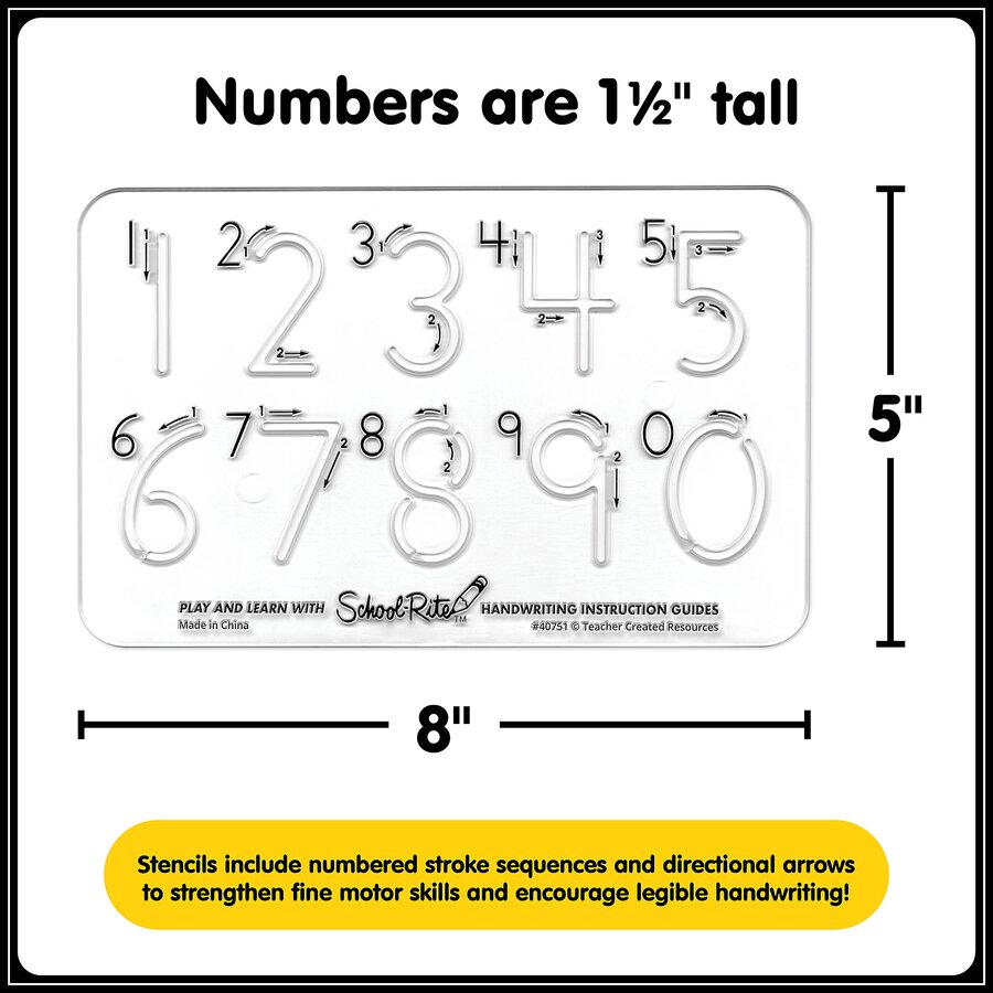 Help students learn how to write legible numbers with this all-in-one stencil. Featuring clean lines and arrows and numbers for guidance, this stencil helps students memorize the strokes for writing any number easily. The guide includes suggested activities to engage even the youngest students in learning to read and write numbers. Template measures 8" x 5". Each number is about 1-1/2" tall.