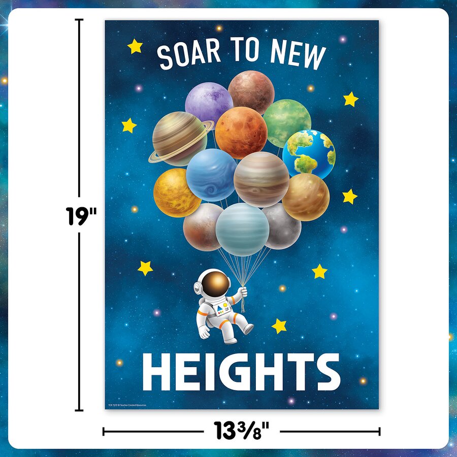 Up, up, and away! Encourage every student to reach their potential with this positive poster. Featuring soft blues, cheerful colors, and an uplifting message, it creates a cosmic calm that’s ideal for every learning space. Hang this astronaut poster on the wall to encourage a growth mindset and persistence during academic challenges. Create a solar-system inspired calm-down corner, or foster a kinder culture at school. Each poster measures 13-3/8" x 19".