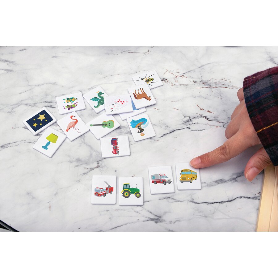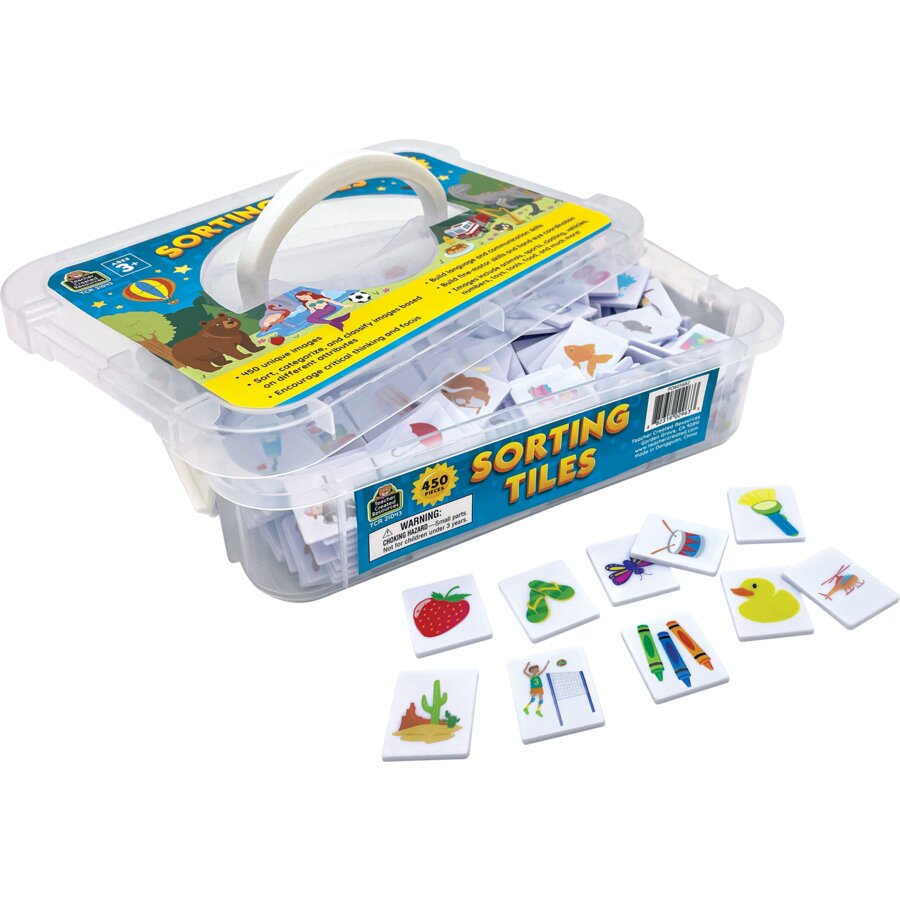 This collection of 450 plastic tiles provides endless learning opportunities. Each tile is printed with a unique image that can be sorted or organized into an infinite number of groups or categories. Young learners can separate the images by shape or color, while older learners can place the images into categories by theme, spelling, or word sound. Each tile includes an easy-to-identify illustration from such categories as food, animals, sports, toys, colors, numbers, shapes, tools, nature, occupations, weather, and more! Additionally, one-sided printing allows the tiles to be arranged facedown for memory and matching activities. A book with activity suggestions is included, but the possibilities for learning are endless!