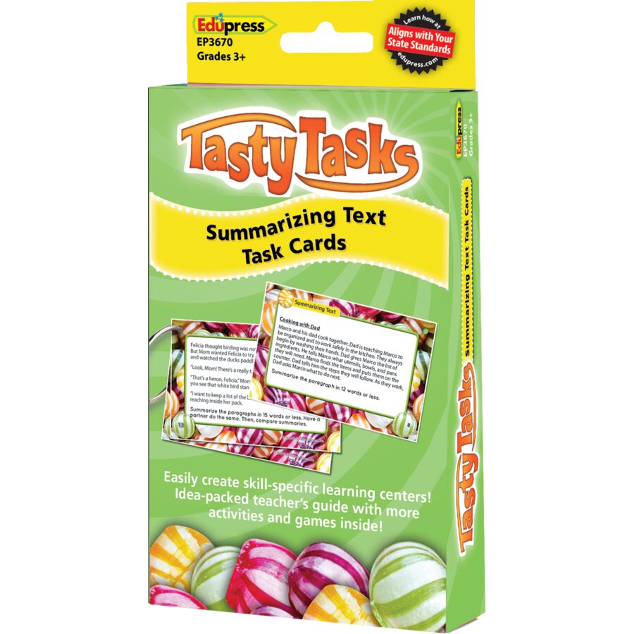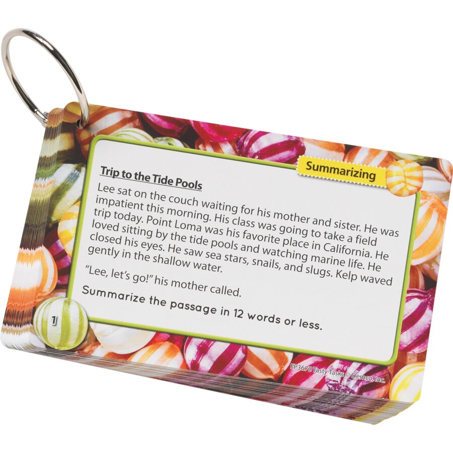 Students will be hungry to learn with these delicious task cards! 96 cards offer practice summarizing fiction and Nonfiction text in a variety of question formats. An idea-packed teacher's guide offers tips for using the cards as a learning center, plus a variety of games and activities to add some flavor to your lesson plans! 48 double-sided cards, two rings, and a reproducible answer key. Cards measure 3-1/2" x 5-1/2".